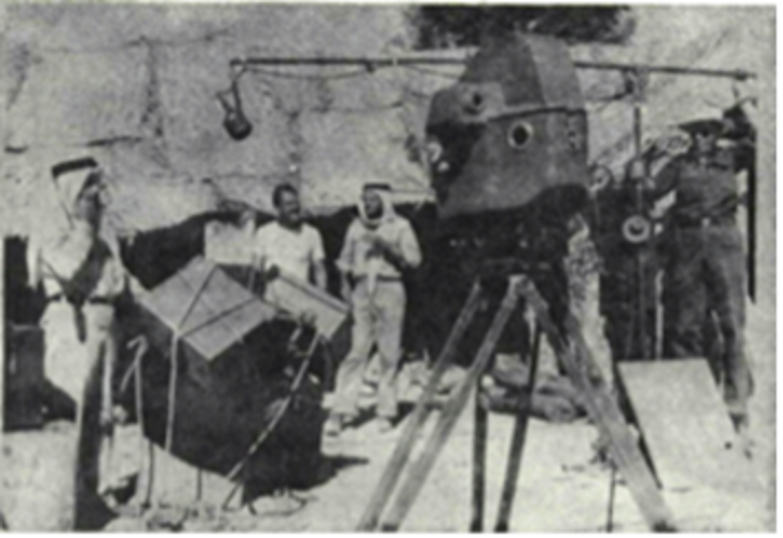 صورة تُظهر ما وراء الكواليس في فيلم "جزيرة العرب"، الذي يتضمن مشاهد نادرة لمواقع مختلفة من المملكة. نشرة " Arabian Sun And Flare"، 15 يونيو 1955، (أرشيف أرامكو).