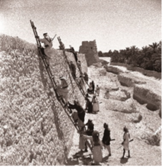 صورة لمشهد من مشاهد الفيلم، تُمثِّل وصول رجال الملك عبدالعزيز إلى الهفوف (مصدر الصورة: كتاب "إمداد العالم بالطاقة.. قصة أرامكو السعودية"، 2012).
