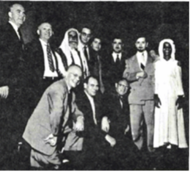ي يمين الصورة، يظهر ناصر بابتسامة مشرقة بين مجموعة من طاقم فيلم "جزيرة العرب"، في صورة التُقطت بمناسبة العرض الأول. (نشرة "Arabian Sun And Flare "، 15 يونيو 1955، أرشيف أرامكو).