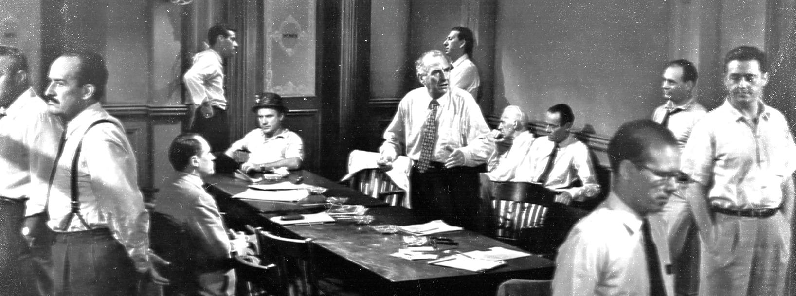 لا يبدأ الفيلم بالغرفة مباشرةً، لكنه ينتقل إليها أسرع مما نتوقع لنقيم فيها أكثر مما نحتمل. ينفتح المشهد الأول بلقطةٍ على مروحة السقف، تنزل منها إلى رأس المتهم، فوجهه المتعرِّق، مع صوت القاضي وهو يتلو على المحلَّفين توجيهاته الأخيرة قبل أن ينعزلوا للمداولات. وعلى السلم الهابط (هبوطنا من الفكرة إلى الواقع) يتتابع الرجال نازعين معاطفهم من شدة الحَرِّ، وفي الحجرة يرصُّون طاولات صغيرة مختلفة الأشكال والارتفاعات لتبدو طاولة واحدة، تبتلع الحيز المكاني الأكبر في رمزية للعدالة المتأتية من اصطفاف المحلَّفين من مرجعيات ثقافية متنوعة لتحقيق الهدف. حين يبتُّ الرجال في القضية، نخرج من الغرفة في مشهد أخير، وكأن المخرج استخدم الخارج تأطيرًا للحدث: متى يبدأ ومتى ينتهي؟