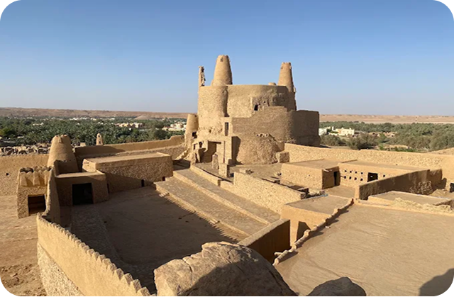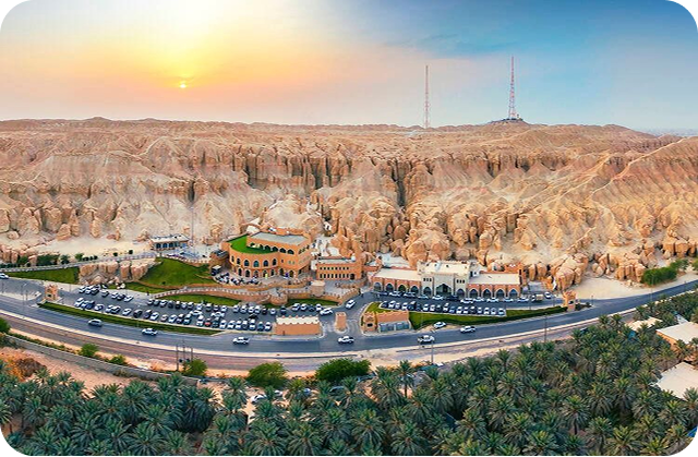 واحة خضراء شرق السعودية، تشتهر بالنخيل والعيون الجوفية.